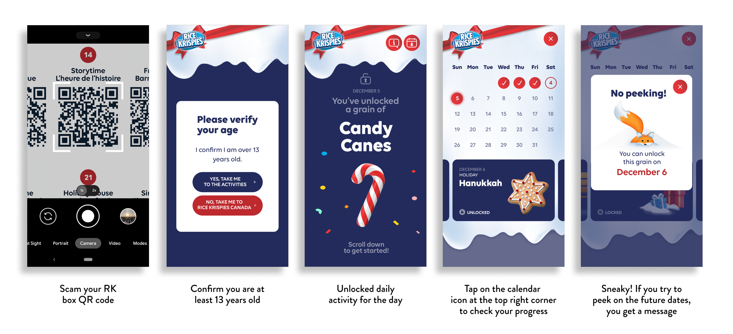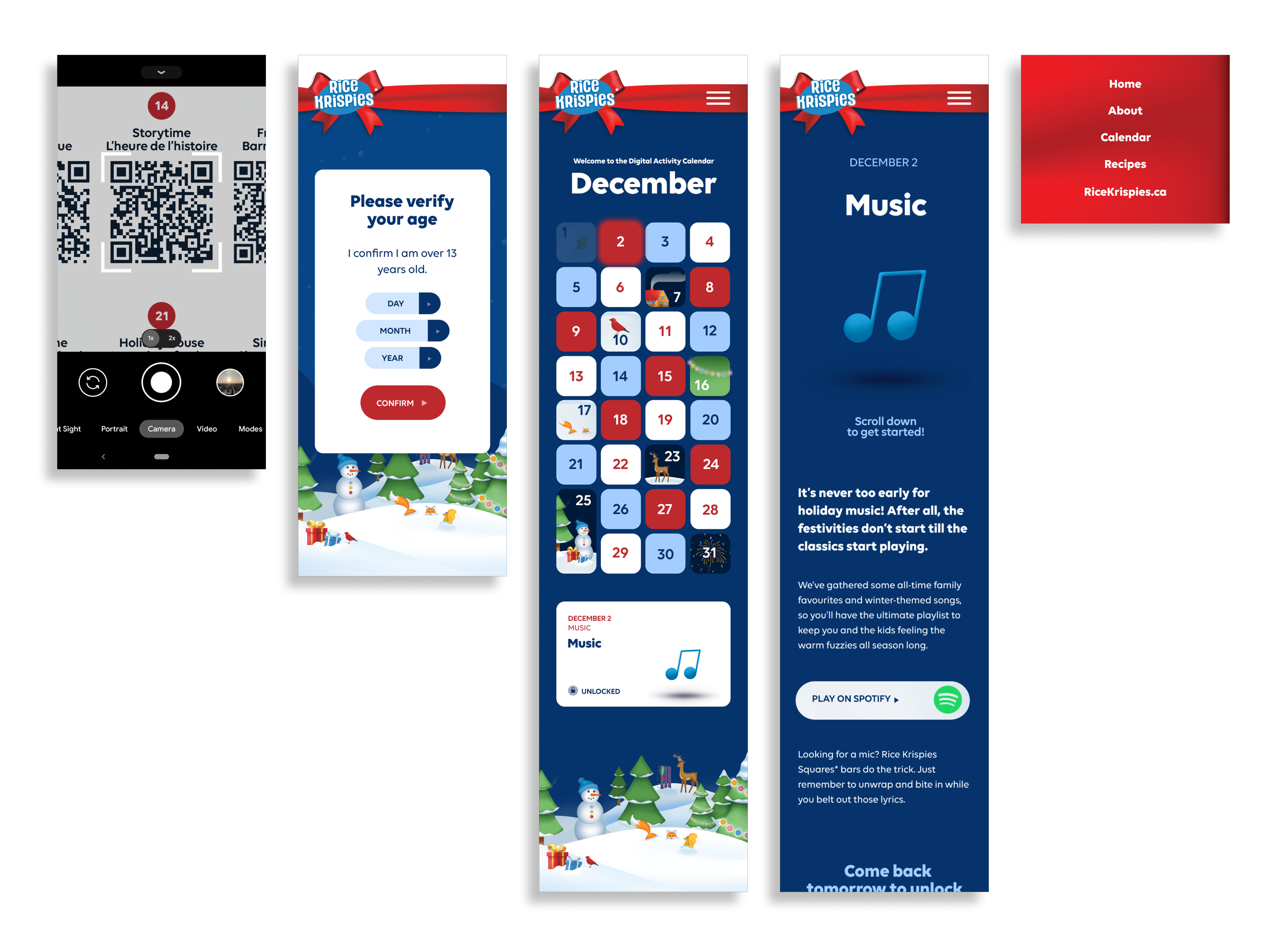 The Rice Krispies® Digital Advent Calendar is an annual mobile experience that starts with a box of your favourite treats. Once you scan the QR code, you open up a calendar with daily activities for the whole family during December. We started the tradition in 2021, and in 2022 we learned from it, leading us to enhance and elevate the overall app experience.